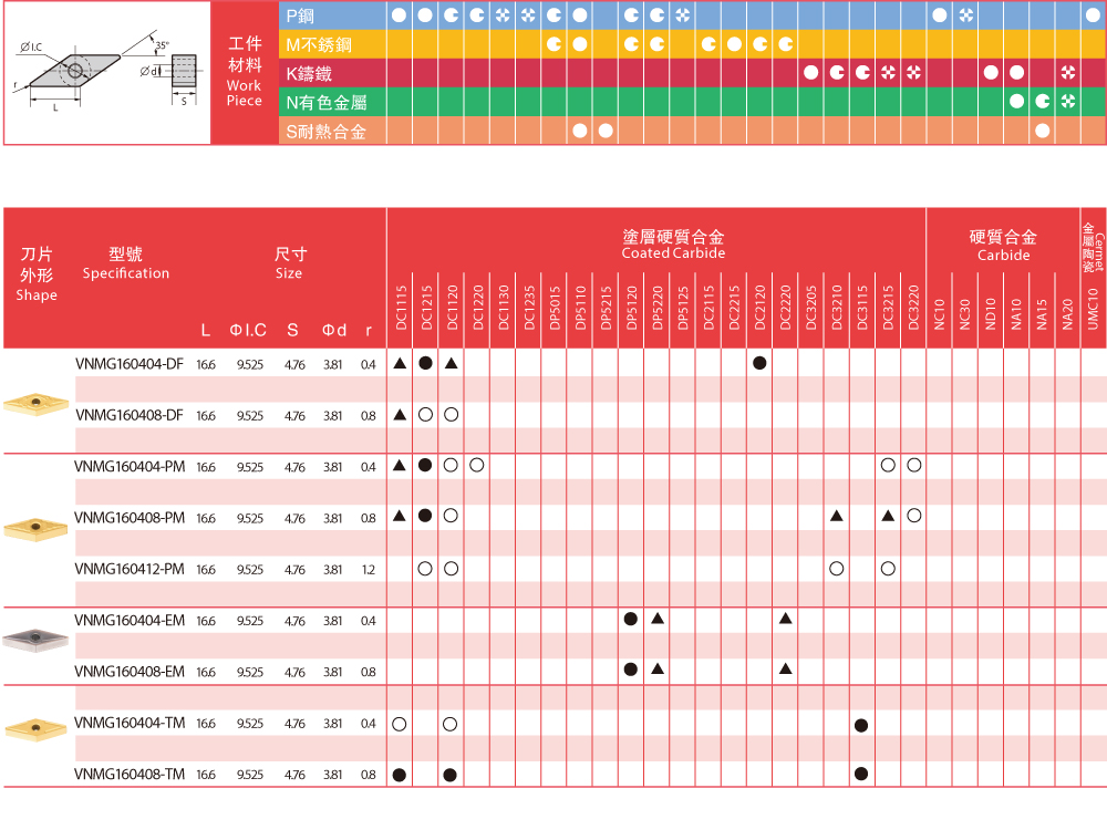 | Insert Grades - Turning 車削刀片牌號一覽表 |